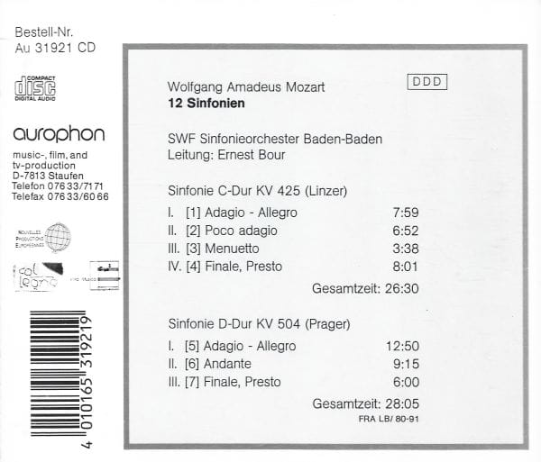 Mozart - SWF Sinfonieorchester Baden-Baden, Ernest Bour – Sinfonien · Sinfonie C-Dur KV 425 (Linzer) · Sinfonie D-Dur KV 504 (Prager) (CD)