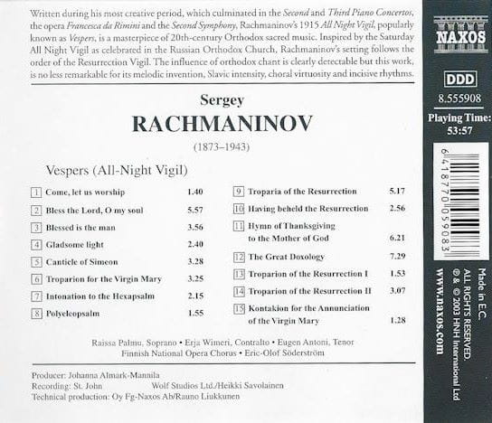 Rachmaninov - Raissa Palmu, Erja Wimeri, Eugen Antoni, Finnish National Opera Chorus, Eric-Olof Söderström – Vespers (CD)