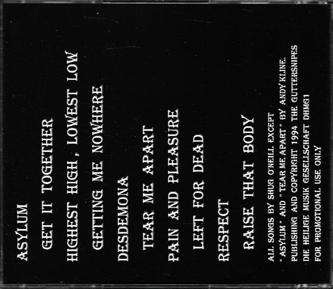 1. Asylum 2. Get It Together 3. Highest High, Lowest Low 4. Getting Me Nowhere 5. Desdemona 6. Tear Me Apart 7. Pain And Pleasure 8. Left For Dead 9. Respect 10. Raise That Body